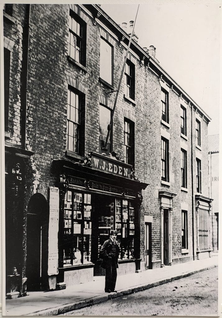 This photo shows WJ Eden – ‘Bookseller, Printer, Stationer, Bookbinder’ of Victoria Street West, Grimsby. A copy can be seen on the staircase to the basement in the library.